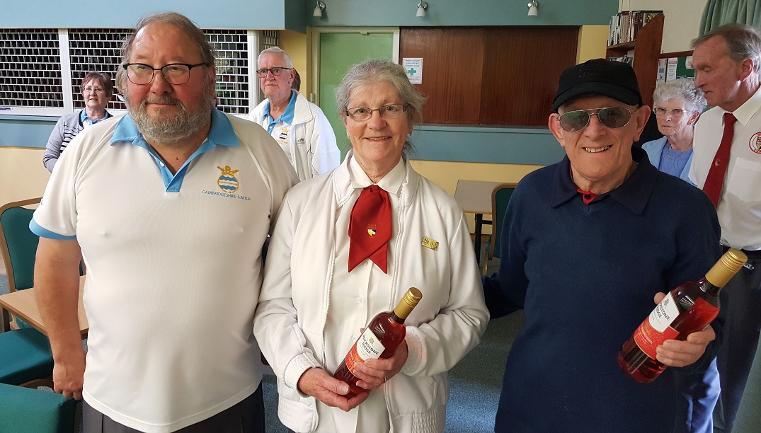 Cambridgeshire hosted this year’s Eastern England Over 60’s Presentation Day at March IBC where Cambs welcomed Norfolk Over 60’s and Northants Seniors. One bowler from each side played together in mixed triples enjoying three games of ten ends each with Cambridgeshire providing lunch for everyone. Everyone had a great day and at the end Cambridgeshire Chairman Gerry Russell presented Norfolk Over 60’s Manager Teresa Goldsmith with the Eastern England Over 60's Champions Shield for finishing top of the table this season ahead of Northants Seniors who were runners-up. The winners of the days mixed triples, Gerry Russell of Cambs, Joan Costello of Norfolk & Robin Patching of Northants, were presented with bottles of drink.